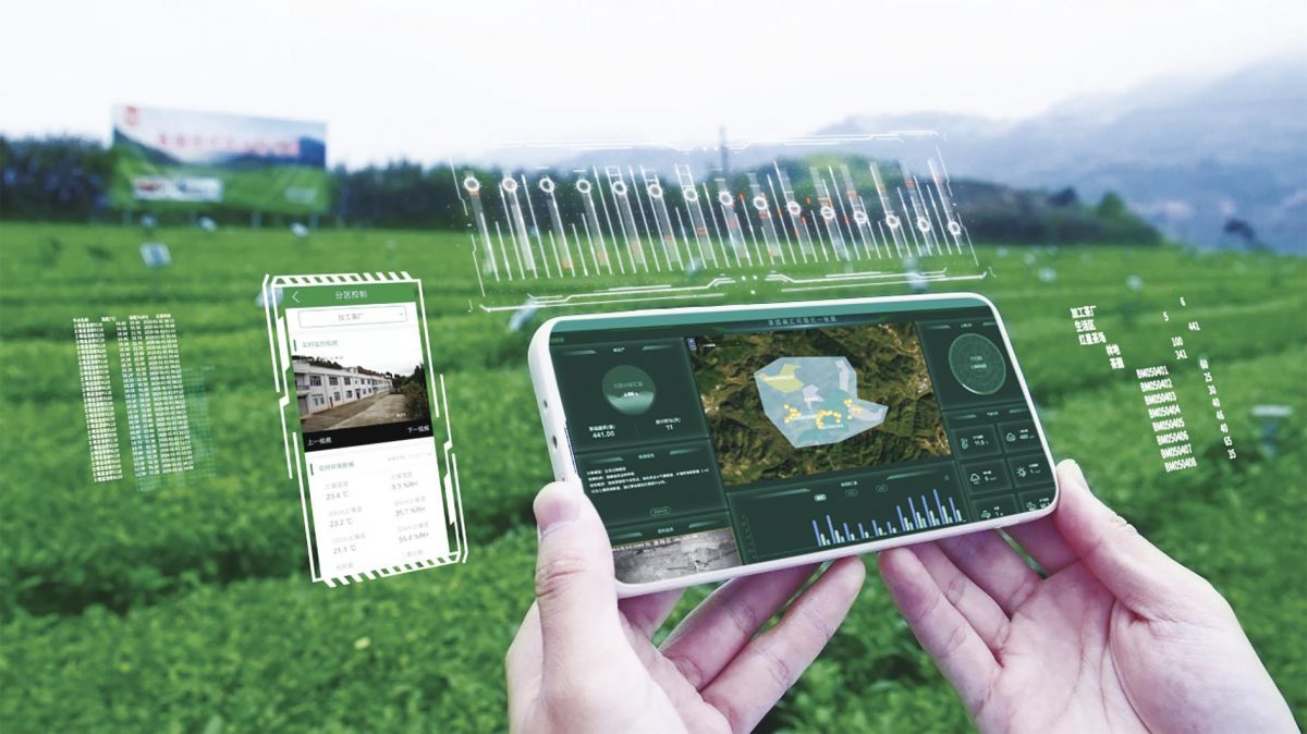 “高山云雾出好茶。电子景象形象屏及时跳动土壤温湿度、肥力指数等数据正在大宝峰无机茶厂的茶园里,